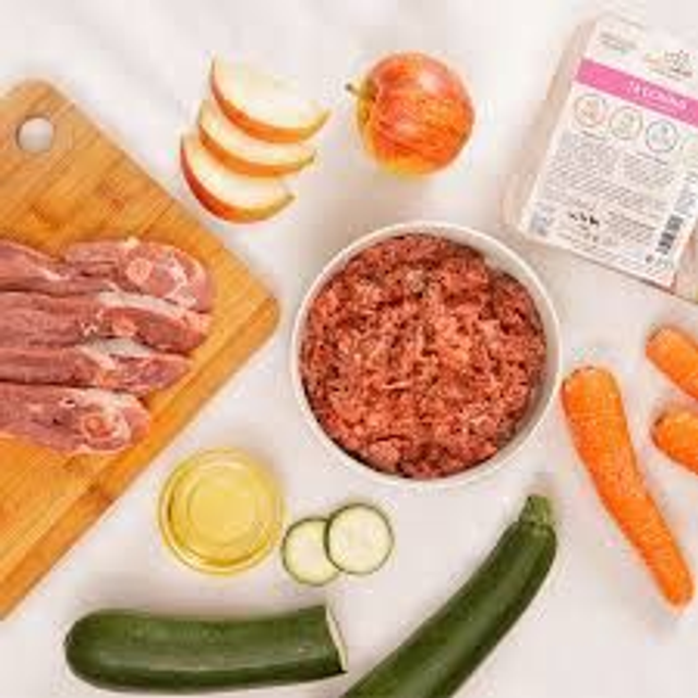 Osso carnoso di tacchino: 35%, carne di tacchino: 25%, ventriglio di tacchino: 10%, fegato di tacchino: 8%, grasso di tacchino: 4%, carota: 4%, mela: 4%, zucchine: 2%, prezzemolo: 1%, broccoli: 1%, Ascophyllum nodosum (alghe e olio d'oliva: 1%